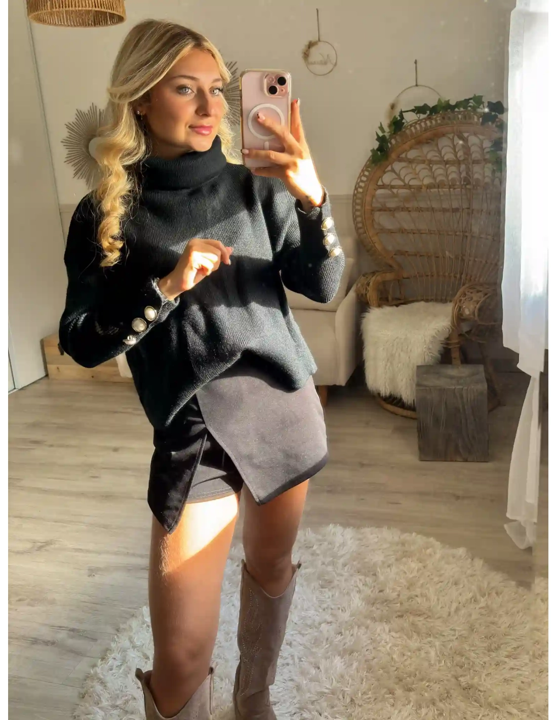 Ce pull col roulé est l'allié parfait pour un look chic et cosy. Confortable et élégant, il se distingue par ses magnifiques boutons dorés sur les manches, qui ajoute une touche de raffinement à vos tenues. Facile à associer avec une jupe ou un pantalon, il vous tiendra bien au chaud.