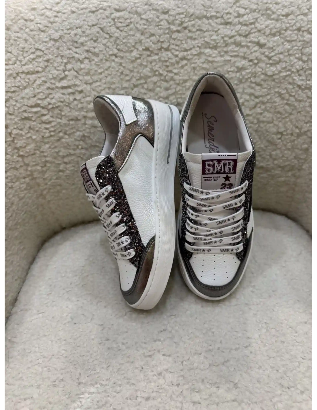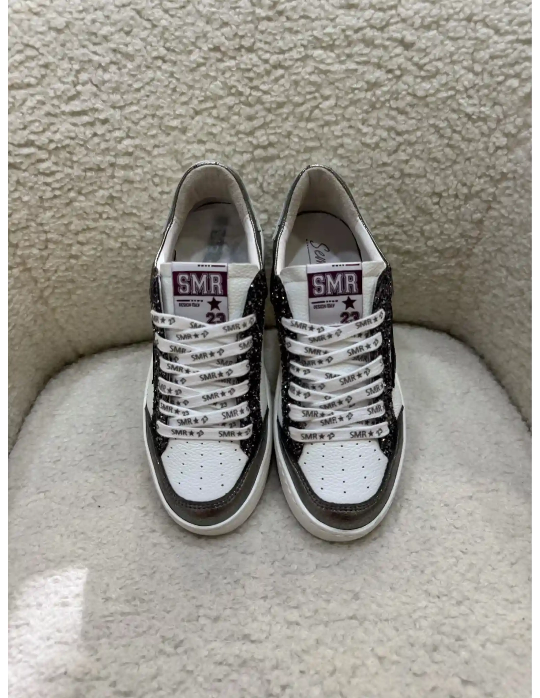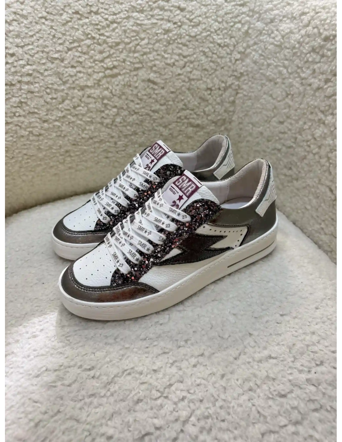 Les baskets Noubar de chez SMR C762 sont dotées d'une tige en cuir et textile, combinant différentes matériaux pour un style unique. Ces baskets présentent des empiècements en glitter noir rosé, une tige en cuir texturé, et des empiècements en cuir avec un aspect brillant. Elles disposent également de lacets blancs SMR, de perforations, d'une semelle blanche. Le logo SMR est visible sur la languette.