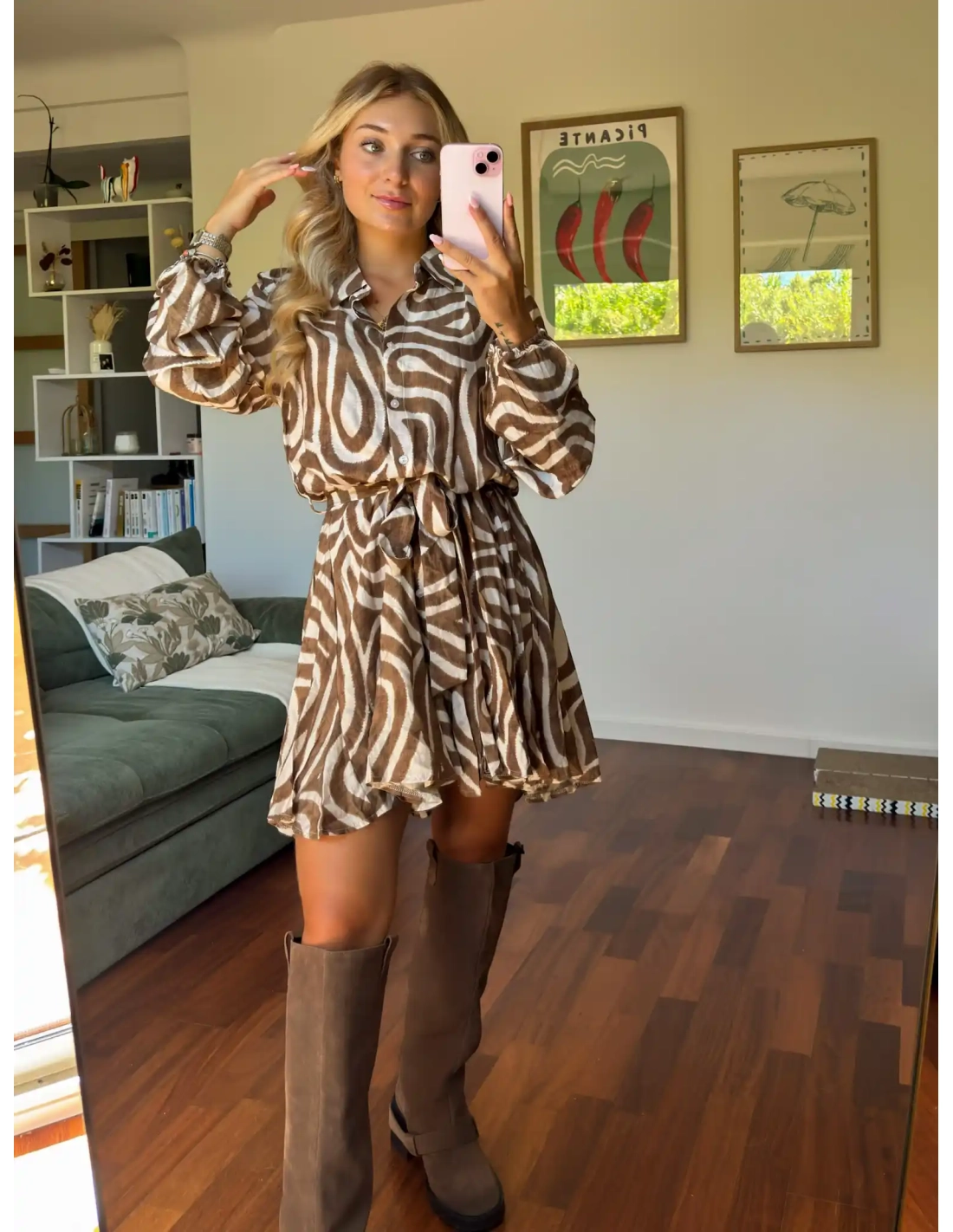Craquez pour cette joli petite robe chemise grâce à son imprimé graphique aux lignes ondulées qui apportent une touche contemporaine et artistique. Confectionnée dans un tissu fluide et léger, elle combine confort et style idéal pour la mi-saison.