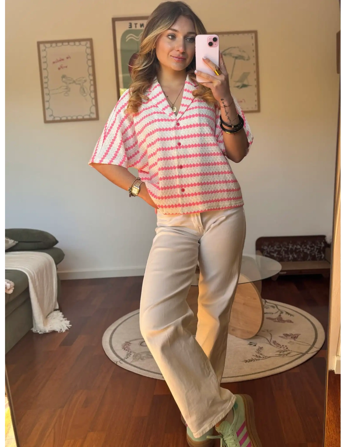 Ajoutez une touche vintage et artisanale à votre garde-robe avec ce polo en crochet. Son motif fà rayures en beige et noir apporte une belle harmonie de couleurs et une allure bohème chic. Sa coupe manches courtes et son col en polo le rendent craquant.
