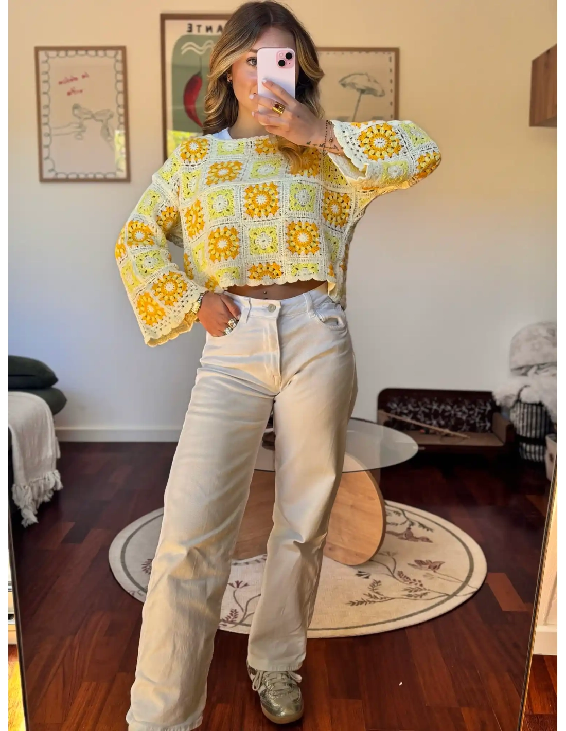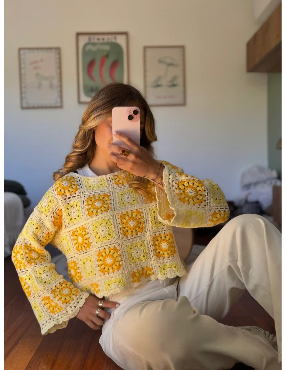 Apportez une touche solaire à votre dressing avec ce magnifique pull en crochet style bohème. Son design composé de carrés crochetés aux nuances de jaune et crème lui donne un charme rétro irrésistible, très tendance cette saison.