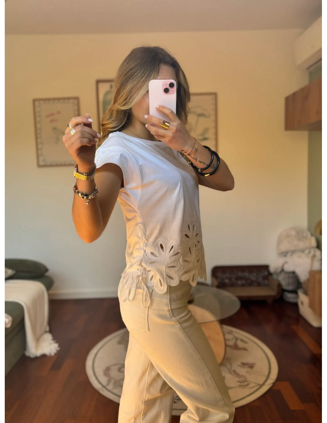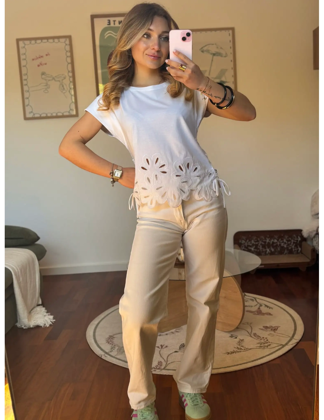 Sa coupe fluide est idéal pour un look décontracté mais soigné. On adore ses maxi fleurs ajourées à l’ourlet, un détail original et délicat qui apporte du relief et une véritable signature mode à la pièce.