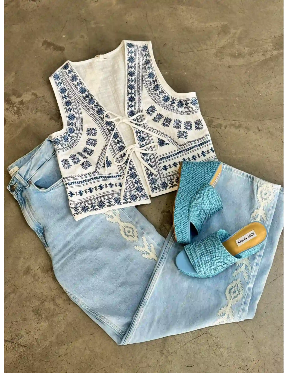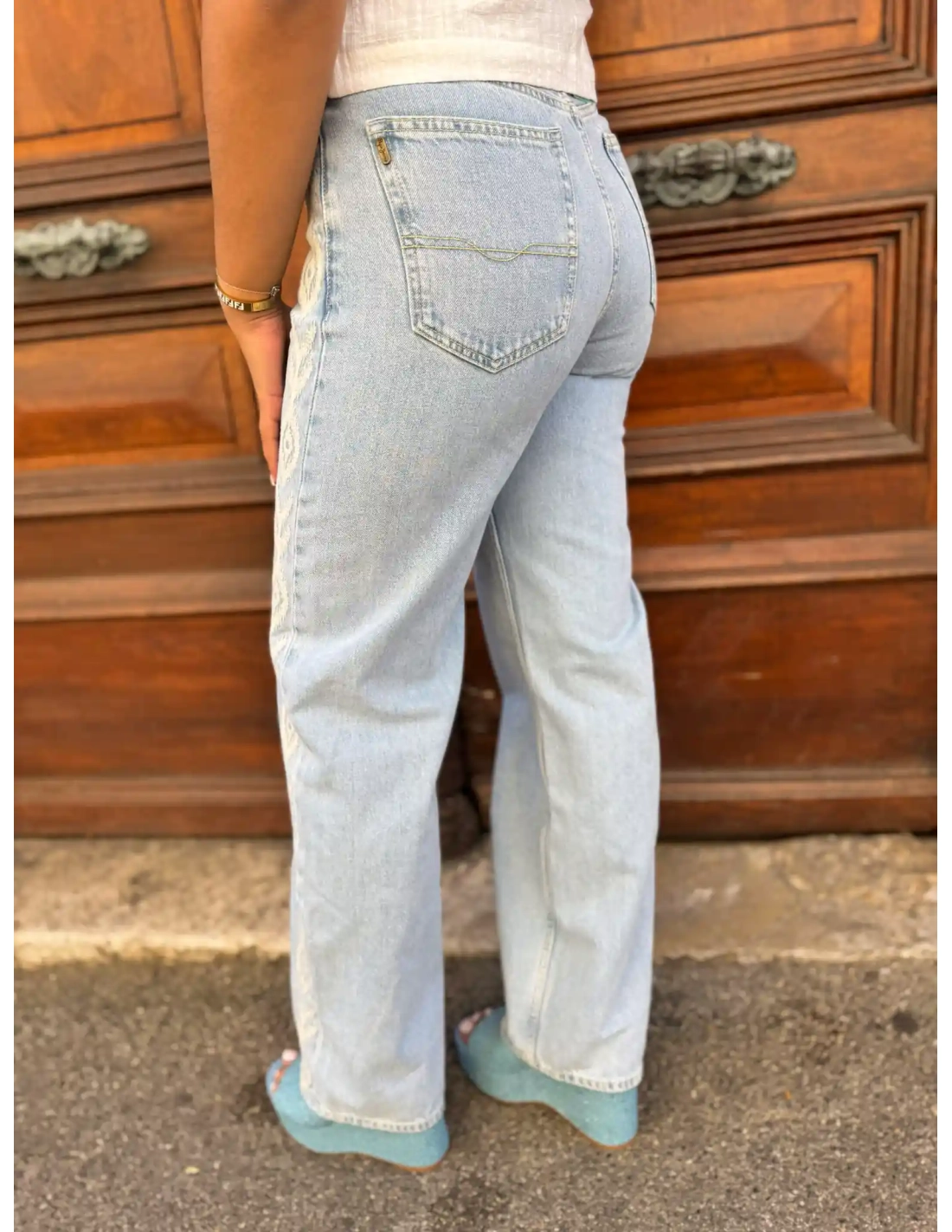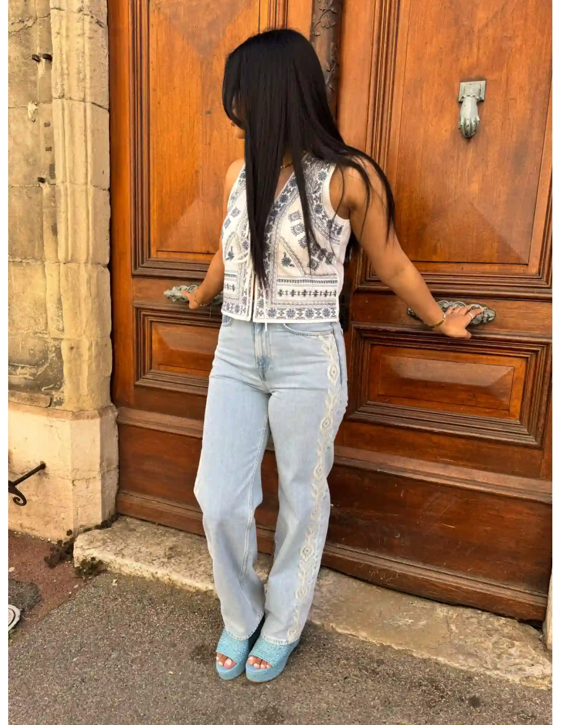 Confectionné dans un denim rigide au délavage bleu clair, il apporte un look authentique et légèrement vintage. Les broderies ikat discrètes le long des coutures latérales ajoutent une touche originale tout en restant faciles à associer.