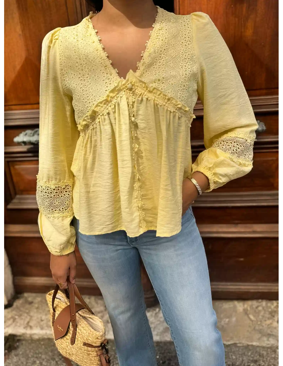 Laissez-vous séduire par la blouse Solea, une pièce délicate et lumineuse qui incarne parfaitement l’esprit romantique et estival. Avec sa teinte jaune pastel ultra douce et ses détails en dentelle, elle apporte une touche de fraîcheur à toutes vos tenues.